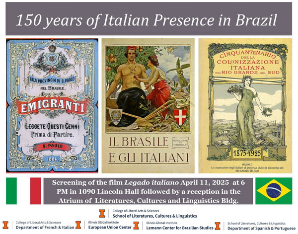 On April 11th, at 6:00 PM, in 1090 Lincoln Hall you are invited to watch a screening of a documentary (in Portuguese with English subtitles) focused on Italian immigration in Brazil, organized by the Department of Spanish and Portuguese, the Department of French and Italian, and the School of Literatures, Cultures, and Linguistics at the University of Illinois at Urbana-Champaign. This event commemorates 150 years of cultural exchange between Brazil and Italy. It will commence with a brief reception, followed by the documentary screening, and will conclude with a discussion involving community members on the subject matter. Please note that space is limited. We kindly encourage those interested in attending to register at their earliest convenience.