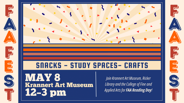 In collaboration with the College of Fine & Applied Arts at Illinois and Ricker Library for Art and Architecture, Krannert Art Museum is proud to host FAA Finals Fest, a Reading Day program that includes a coffee bar, snacks, study space, and art-making for students. Outlets and study tables will be provided in our galleries for students seeking a calm and inspiring place to study.The museum offers a variety of accessibility supports to help ensure all visitors can fully participate in our programs and events. Please email us at kam-accessibility@illinois.edu if you have any questions, or to request accommodation for an upcoming visit or event.Partially supported by a grant from the Illinois Arts Council Agency