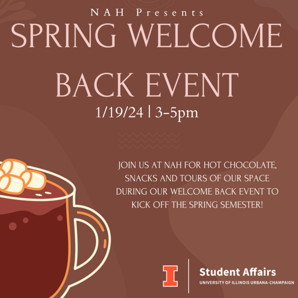 U of I community, join the Native American House for a spring semester Welcome Back Event on Friday, January 19th from 3-5pm at NAH! End the first week of classes by enjoying hot chocolate and snacks while learning more about NAH. Save the date, see you then!