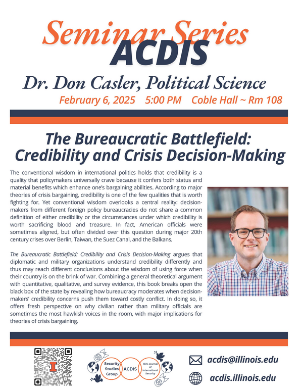 The Bureaucratic Battlefield: Credibility and Crisis Decision-Making argues that diplomatic and military organizations understand credibility differently and thus may reach different conclusions about the wisdom of using force when their country is on the brink of war. Combining a general theoretical argument with quantitative, qualitative, and survey evidence, this book breaks open the black box of the state by revealing how bureaucracy moderates when decision-makers’ credibility concerns push them toward costly conflict. In doing so, it offers fresh perspective on why civilian rather than military officials are sometimes the most hawkish voices in the room, with major implications for theories of crisis bargaining.Bio: