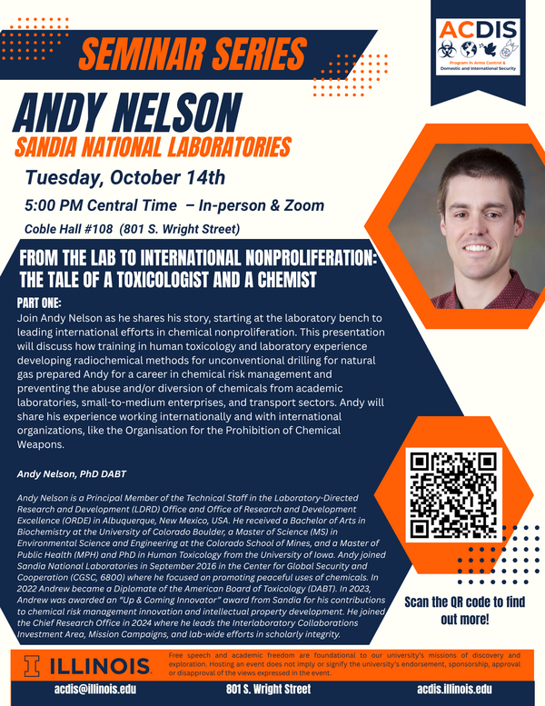 Join Andy Nelson on October 14th as he shares his story, starting at the laboratory bench to leading international efforts in chemical non-proliferation. This presentation will discuss how training in human toxicology and laboratory experience developing radiochemical methods for unconventional drilling for natural gas prepared Andy for a career in chemical risk management and preventing the abuse and/or diversion of chemicals from academic laboratories, small-to-medium enterprises, and transport sectors. Andy will share his experience working internationally and with international organizations, like the Organisation for the Prohibition of Chemical Weapons.