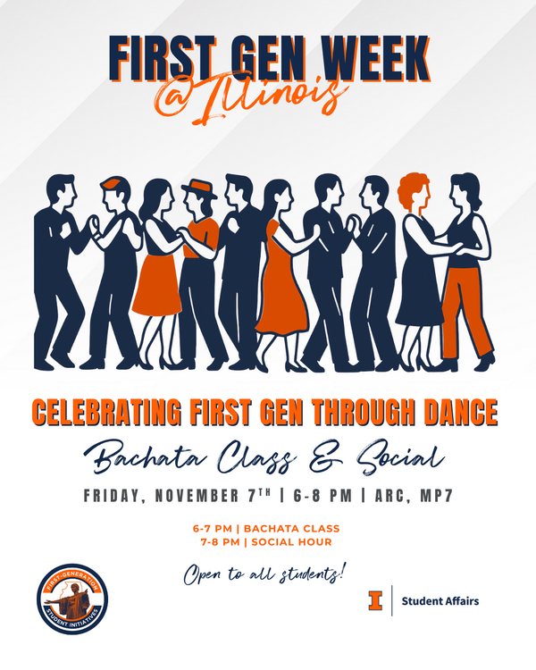 Join fellow first-gen students to learn or show off your Bachata skills! Learn from fellow Illinois grad student instructors. Open to all students regardless of dance background. I-Card and signed waiver form is required for participation. More details to come!