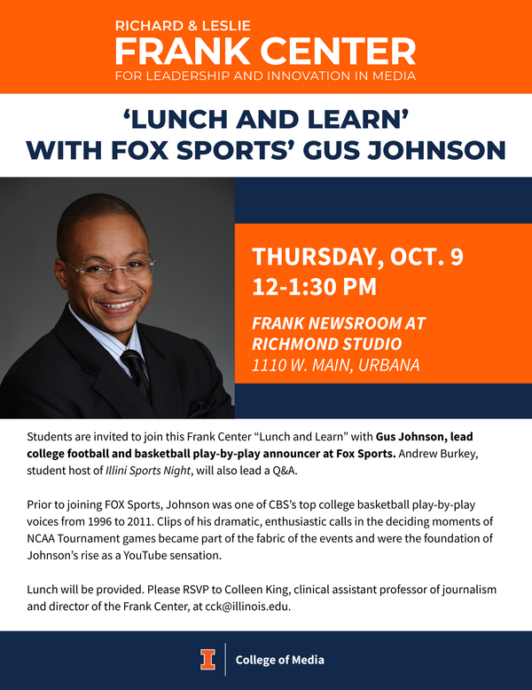Students are invited to join this Frank Center “Lunch and Learn” with Gus Johnson, lead college football and basketball play-by-play announcer at FOX Sports. Andrew Burkey, student host of Illini Sports Night, will also lead a Q&A.