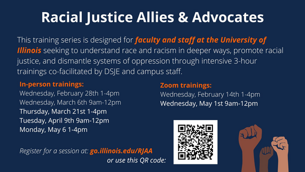 The Racial Justice Allies and Advocates Training program is designed to provide faculty and staff with a core awareness of the structures of racism, its role in interpersonal relationships, and empower allies to elevate the voices of underrepresented populations at the University of Illinois.