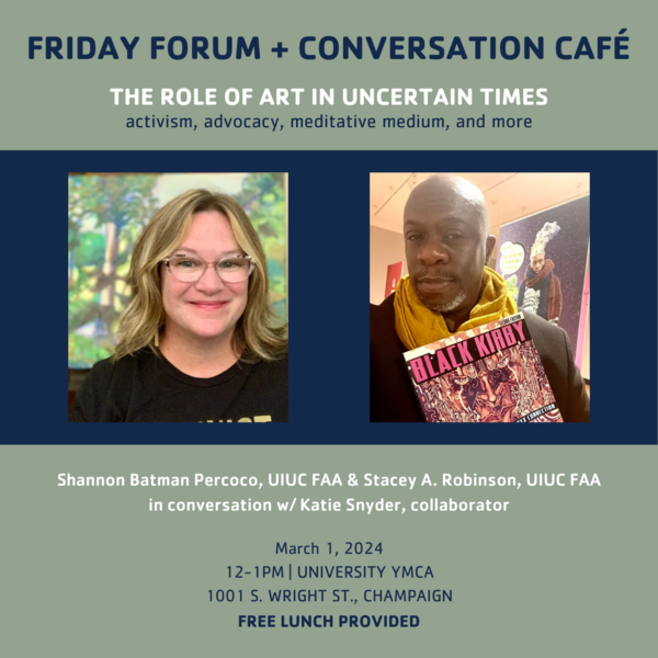 Series sponsored by Center for Advanced Study, Center for Global Studies and U.S. Department of Education Title VI Grant, College of ACES, College of Education, Counseling Center, Department of African American Studies, Department of Psychology, Department of Urban & Regional Planning, Education Justice Project, First Mennonite Church of Champaign-Urbana, Humanities Research Institute, Illini Hillel, Institute for Sustainability, Energy, and Environment, League of Women Voters of Champaign County, Office of the Provost, Office of the Vice Chancellor for Student Affairs, School of Social Work, Sinai Temple, Social Action Council of the Unitarian-Universalist Church of Urbana-Champaign, Student Cultural Programming Fee, Urbana Champaign Friends Meeting, Urbana-Champaign Reproductive Justice, and Women & Gender in Global Perspectives.