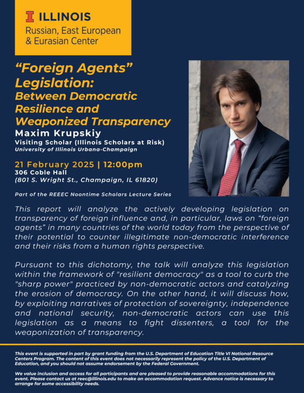 Maxim Krupskiy joined the Illinois Scholars at Risk Program in the fall of 2024. He is a Ph.D. in Philosophy, human rights defender and attorney-at-law with more than twelve years of experience practicing law in Russia. Throughout his work, he has worked with many Russian and international NGOs, defending rights of refugees and asylum seekers, Russian civil activists persecuted for political reasons, and NGOs labeled as “foreign agents” by Russian authorities. His current research focuses on the comparative analysis of foreign influence transparency legislation and, in particular, “foreign agents” laws in Russia, Eastern Europe, Eurasia and beyond. This spring semester, Dr. Krupskiy is teaching a new course "Contemporary Autocracy in Theory, Law, and Practice," which analyzes contemporary autocratic practices and the challenges they pose to the democratic order regionally and globally.