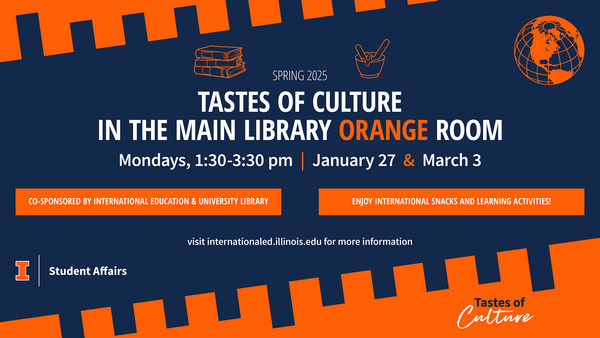 Enjoy some international snacks and drinks with cross-cultural learning activities. Sponsored by International Education and the University Library.
