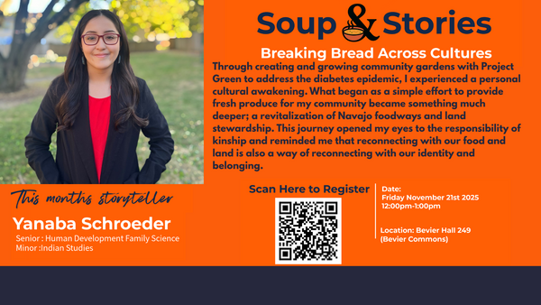 Through creating and growing community gardens with Project Green to address the diabetes epidemic, Yanaba Schroeder (Navajo; Major: Human Development & Family Studies) experienced a personal cultural awakening. What began as a simple effort to provide fresh produce for my community became something much deeper; a revitalization of Navajo foodways and land stewardship. This journey opened her eyes to the responsibility of kinship and reminded Yanaba that reconnecting with their food and land is also a way of reconnecting with our identity and belonging.