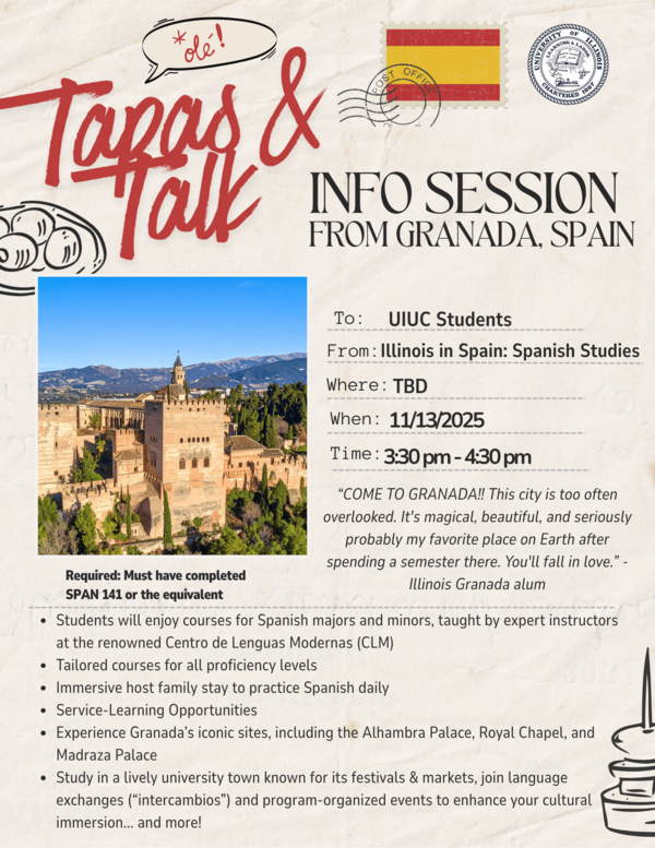 Interested in studying abroad in one of Spain’s most vibrant and culturally rich cities? Come enjoy light tapas and learn all about the Illinois in Spain: Spanish Studies in Granada program!