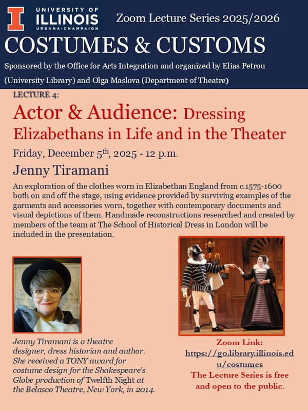 The Costumes & Customs Lecture Series, sponsored by the Office of Arts Integration and organized in collaboration with the University Library, the Department of Theatre, the Department of Classics, the Spurlock Museum, and the Krannert Art Museum, explores the history and cultural significance of clothing across time and place. Organized by Elias Petrou (University Library) and Olga Maslova (Department of Theatre), the series will feature four distinguished speakers: Dr. Bernice Jones - Minoan Era (Wednesday, September 17, 5:00 p.m. CT), Dr. Ulla Mannering - Viking Age (Thursday, October 23, 5:00 p.m. CT), Dr. Susan Whitfield - Middle Ages (Wednesday, November 5, 5:00 p.m. CT), and Dr. Jenny Tiramani - Elizabethan Era (Friday, December 5, 12:00 p.m. CT). All lectures will be held via Zoom and are free and open to the public: https://go.library.illinois.edu/costumes