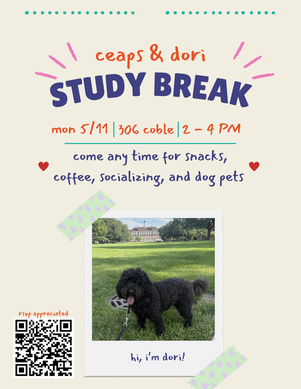 CEAPS will be hosting an informal and social study break during finals week! Anyone is welcome. We will have snacks, coffee, tea, and a special guest... Dori! Dori is Matt Winter's (CEAPS director) friendly dog, who will be also there ready to receive pets and to be played with. Come de-stress with CEAPS and other students.