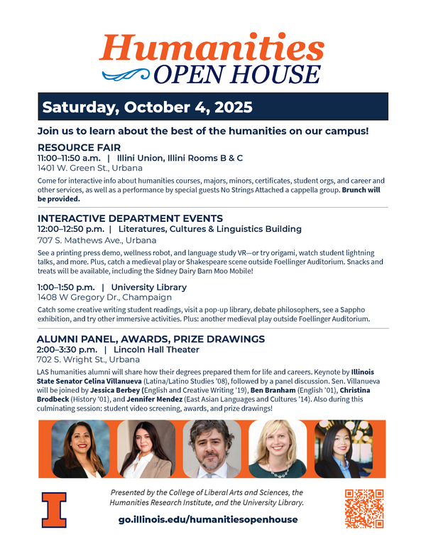 Sample a variety of exciting events showcasing the vibrancy of the humanities on campus. Check out a printing press demo or language study VR, debating Socrates, or writing Chinese calligraphy. Readings, performances, a wellness robot, a pop-up library—these and more are on offer! See full schedule at: go.illinois.edu/humanitiesopenhouse
