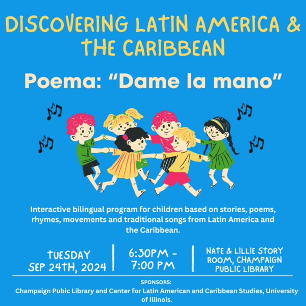 Interactive bilingual program for children based on stories, poems, rhymes, movements and traditional songs from Latin America and the Caribbean. Join us to learn Gabriela Mistral's poem “Dame la mano” presented in Spanish-English,