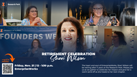 12:00 - 1:30 pmEnterpriseWorks, 60 Hazelwood DriveJoin us to celebrate Sheri Wilson's retirement after 11 years at Research Park on Friday, November 21 from 12:00 to 1:30 p.m.