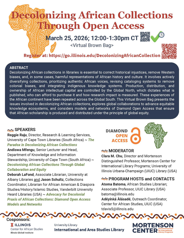 12:00 - 1:30 pmThis Virtual Brown Bag presents the issues involved in decolonizing African collections, explores global collaborations to advance equitable knowledge ecosystems, and considers models and networks of Diamond Open Access that ensure that African scholarship is produced and distributed under the principle of global equity.