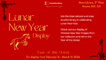 All DayMain Library, 3rd Floor, Rooms 309 & 321This exhibition presents a selection of Chinese nianhua and related images exploring Lunar New Year themes and the horse, offering a glimpse into the hopes, stories, and celebrations they carry. May you enjoy an energetic and fruitful year ahead.