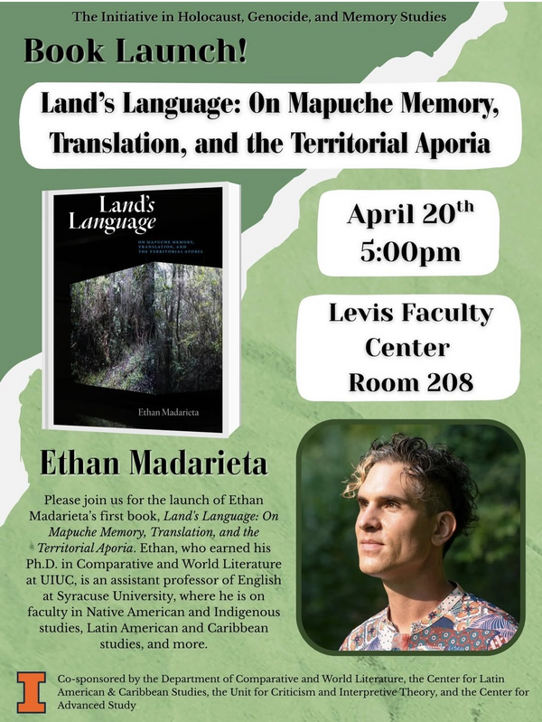 5:00 pmLevis Faculty Center, Room 208Book launch of Ethan Madarieta's Land's Language: On Mapuche Memory, Translation, and the Territorial Aporia.
