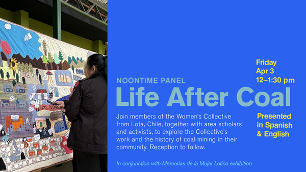 12:00 - 1:30 pmKrannert Art Museum, 500 E. Peabody Dr., ChampaignJoin members of the Women’s Collective from Lota, Chile, together with area scholars and activists, for a midday panel discussion exploring the Collective’s work, the history of coal mining in their community, and the role of arpilleras in preserving bilingual participation. Reception to follow. Presented in Spanish and English.