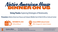 8:30 amSalaam MENA Cultural Center (700 S Gregory St., Suite A, Urbana)Dinner on Us is administered by the Native American House and is part of the Lunch on Us Series within SSIB. DOU is a biweekly, one-hour program featuring scholar- and practitioner-led workshops alongside a shared meal. Workshops explore a range of subjects and provide participants with opportunities to connect with peers and experts in a casual setting.