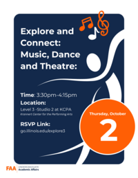 3:30 - 4:15 pmLevel 3 - Studio 2, Krannert Center for the Performing Arts 3:30 - 4:15 pmLevel 3 - Studio 2, Krannert Center for the Performing ArtsDive into the vibrant worlds of music, dance, and theatre—explore creative opportunities, connect with peers, and discover how your talents can shine both on stage and beyond.