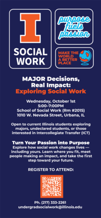 10:00 - 11:30 amSchool of Social Work Room 2027 10:00 - 11:30 amSchool of Social Work Room 2027In this special session during IlliniFest, come to Room #2027 to learn about how the School of Social Work empowers students to transform their passion for helping others into a meaningful career—and envision yourself creating a future filled with purpose at Illinois!