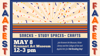 12:00 - 3:00 pm 5/8/2025Krannert Art Museum, 500 E. Peabody Drive, ChampaignCalling all students! Come rest up, study, and relax during this semester's Reading Day! Good luck on finals! FAA Finals Fest includes a coffee bar, snacks, study space, and art-making for students. Outlets and study tables will be provided in our galleries for students seeking a calm and inspiring place to study.