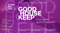 7:00 - 7:45 pm 5/1/2025Krannert Art Museum, 500 E. Peabody Dr., ChampaignEnjoy a dance performance at Krannert Art Museum! Anna Sapozhnikov’s evening-length "Good House Keep" is inspired by midcentury modern spaces throughout Champaign-Urbana, in conjunction with the Making Place for the Arts at Home: Performance and Midcentury Modern Architecture exhibition. Collaborators include fellow faculty members from the Department of Dance.
