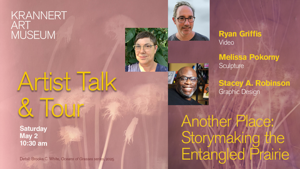 10:30 - 11:30 am 5/2/2026Krannert Art Museum, 500 E. Peabody Dr., ChampaignJoin us for a special tour led by exhibiting artists from Another Place: Storymaking the Entangled Prairie. Gain insights into their creative practice and research. Today's tour features Ryan Griffis (video), Melissa Pokorny (sculpture), and Stacey A. Robinson (graphic design).