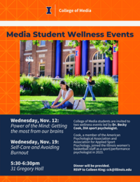 5:30 - 6:30 pm31 Gregory HallCollege of Media students are invited to a wellness event led by Dr. Becky Cook, DIA sport psychologist for the Illinois women's basketball team since 2023. Cook will discuss "Self-Care and Avoiding Burnout." Dinner will be provided.